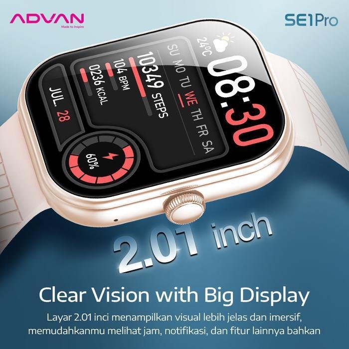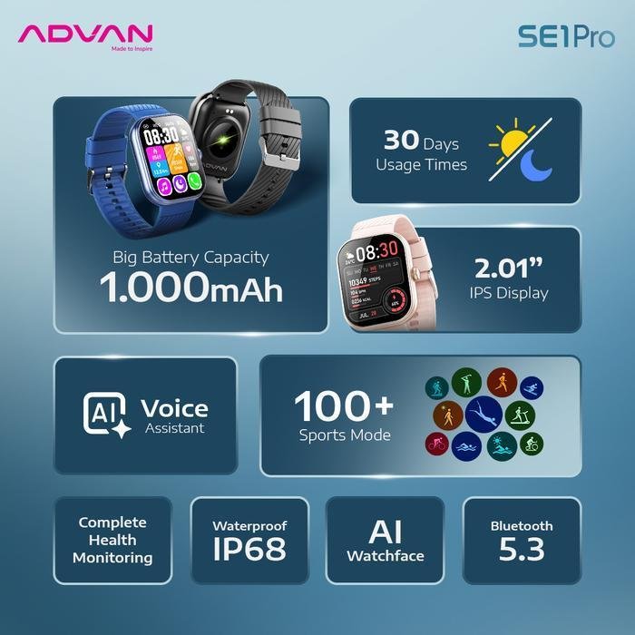 Tingkatkan gaya hidup sehat dan modern Anda dengan ADVAN SE1 Pro, smartwatch pintar yang menggabungkan desain elegan, teknologi mutakhir, dan daya tahan luar biasa.