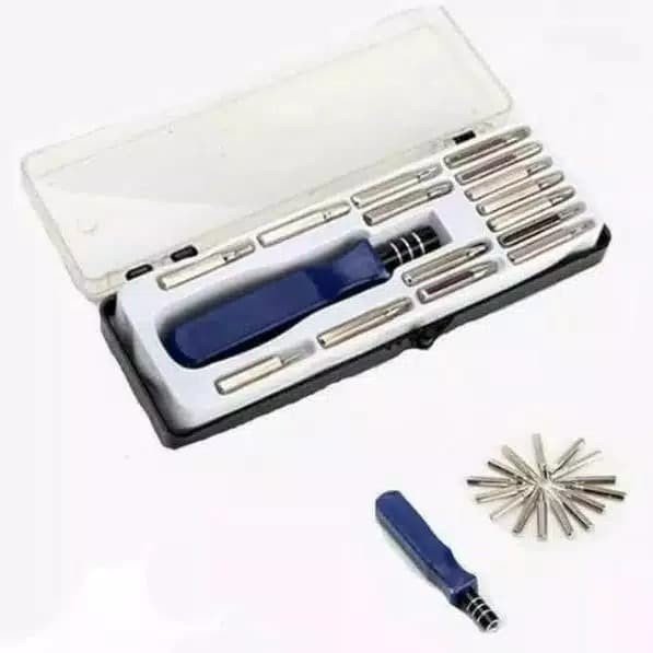 Set obeng kecil lengkap yang terdiri dari 16 kepala obeng + 1 pegangan. Ujung obeng bersifat magnetik.